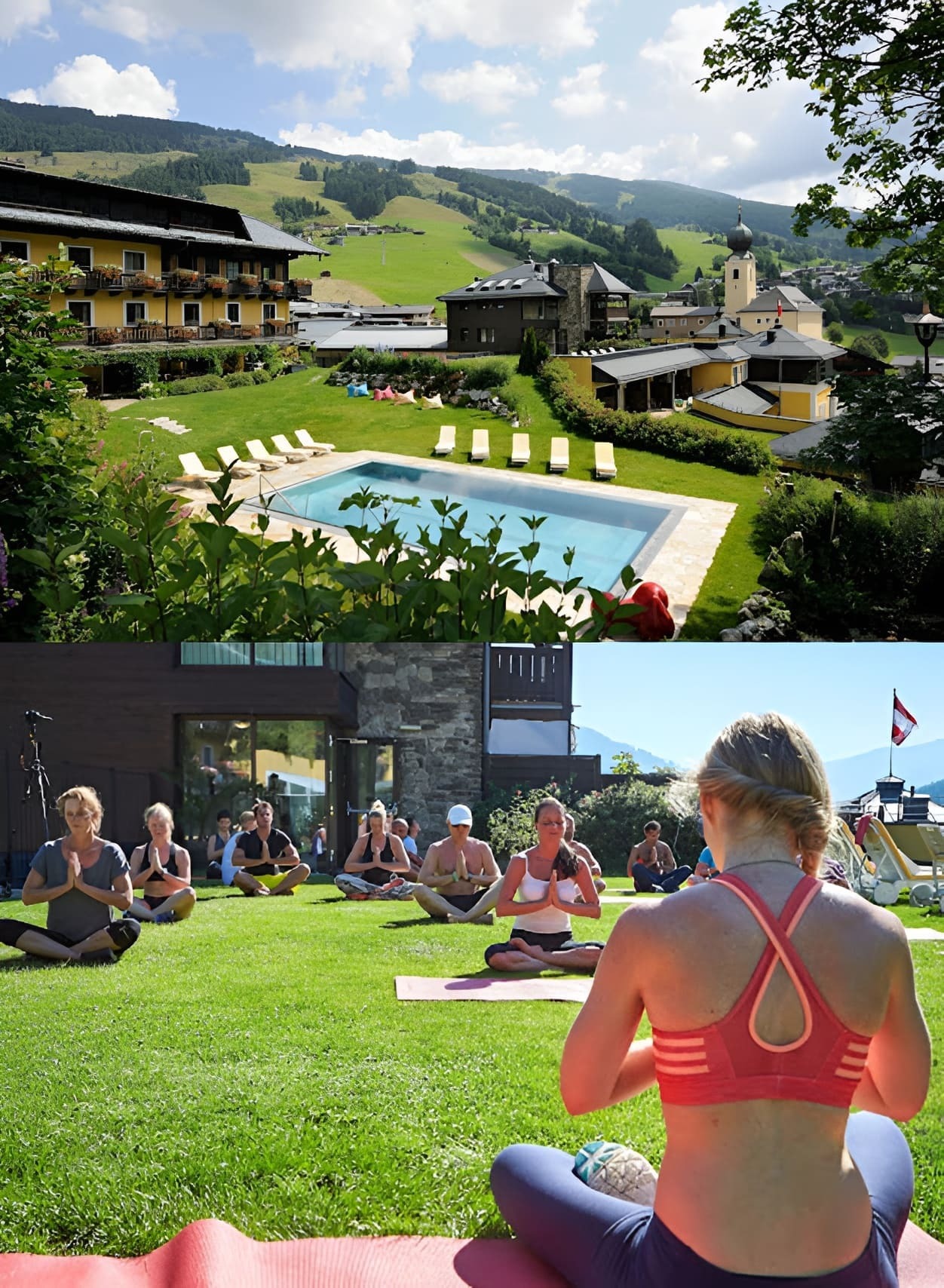 Saalbach is an Austrian Alpine Ski town surrounded by stunning mountains and the Hotel Saalbacher Hof is right in the heart of the town. We have hosted several retreats here and it's our favorite venue and Spa 🙂